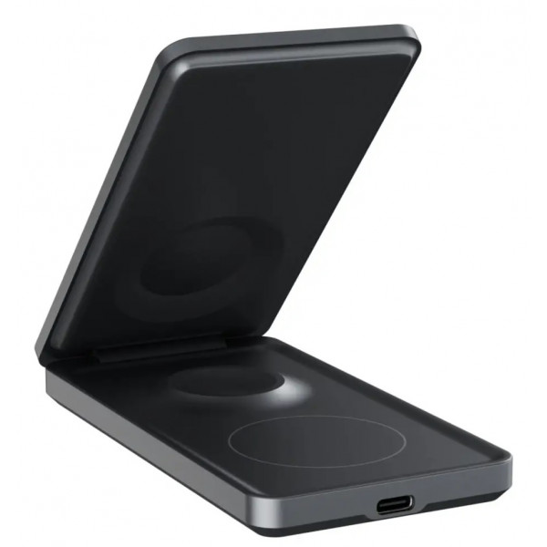 Док-станция Proove Metal Edge 3 in 1 – компактный гаджет для одновременной беспроводной зарядки сразу трех устройств. Это устройство имеет алюминиевый каркас со стеклянным покрытием для предотвращения появления царапин на гаджетах. При этом оно изготовлено в раскладном форм-факторе и не требует много места для установки, а на основной платформе можно заряжать смартфон даже в сложенном состоянии станции. В развернутом виде док-станция имеет три зарядные площадки – основную с регулируемым наклоном, предназначенную для MagSafe-совместимого смартфона, а также две дополнительные, расположенные в задней части, для смарт-часов и беспроводных наушников. К сети этот гаджет подключается через стандартный интерфейс USB Type-C и оснащен многоступенчатой защитой от неполадок при зарядке.